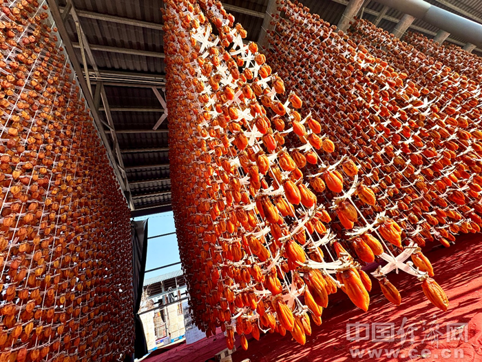 初冬是制作柿饼的最佳时节。走进位于陕西省富平县到贤镇与薛镇交界处的天玺柿子小镇,工人们正忙着制作柿饼。在标准化的晾晒大棚里挂满了剥过皮的柿子,红彤彤的柿子好似一串串红灯笼坠满枝头。