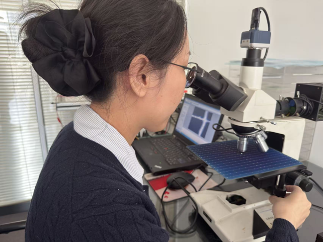 众森电能研发人员在进行光伏电池检测研究。 记者张相成/摄