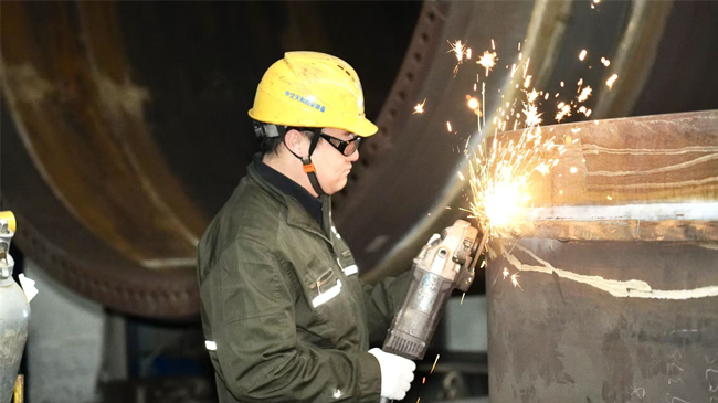 中交天和装备制造厂房工人正在进行风电塔筒制造 徐均坪/摄