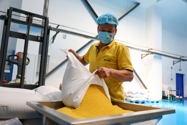 米脂桃花峁小米仓储车间工作人员正在分装小米。