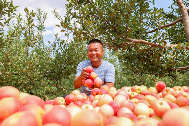 榆林市靖边县龙洲镇果农在采摘苹果。